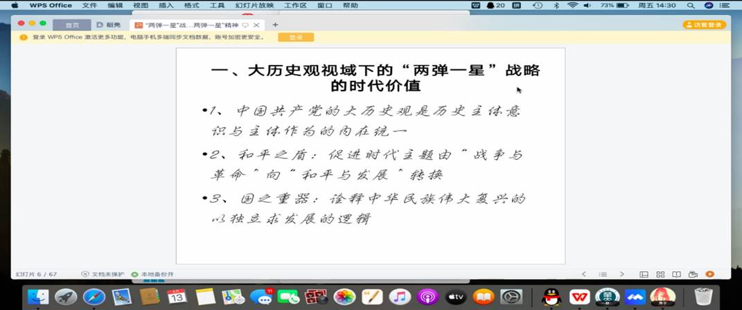 管锦绣教授讲述了中国共产党的大历史观是历史主体意识与主体实践的内在统一。她认为大历史观凸显的是作为历史主体的中国人民在中国共产党的带领下顺应历史发展大势,必须正确把握历史机遇,实现主体推动历史发展的作为。而后,她讲解了大历史观视域下的“两弹一星”战略的时代价值,主要包含了两个方面,分别是:其一,和平之盾:促进时代主题由“战争与革命”向“和平与发展”转换;其二,国之重器:诠释中华民族伟大复兴的以独立求发展的历史逻辑。最后,管教授对所讲内容进行了回顾,她指出人不能改变历史发展规律,只能顺应历史发展规律和发展大势,通过历史事件来推动或者变革历史发展格局,历史发展中的变局意味着我们可以选择“和平与发展”,还是“战争与革命”。列宁的时代观与马克思主义科技观等在“两弹一星”战略中均有体现。管锦绣教授还建议同学们可以阅读一些史料,课后自学“两弹一星”精神。